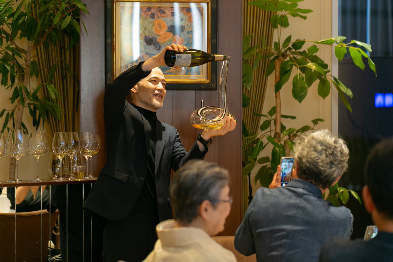 デカンタのデモンストレイションは、赤ワインではなく <菊鹿>ナイト・ハーベスト小伏野で。