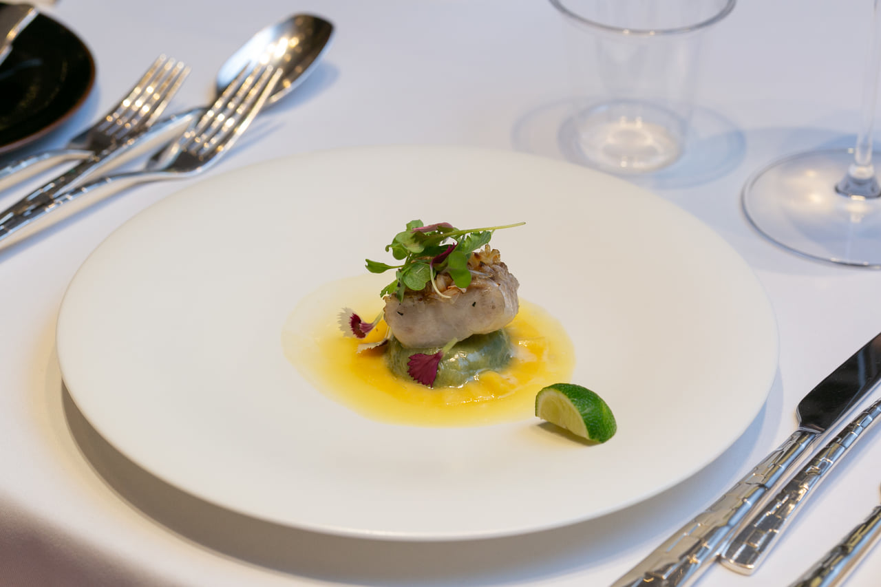甘鯛のうろこ焼き チーズ工房Cacioのリコッタとほうれん草のラビオリ|菊鹿シャルドネ ナイトハーベスト小伏野2018
