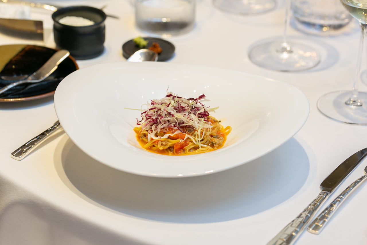 土井農場諫美豚の自家製サルシッチャとフレッシュトマトのスパゲティ| マスカット・ベーリーA・樽熟成 2017(熊本ワインファーム)