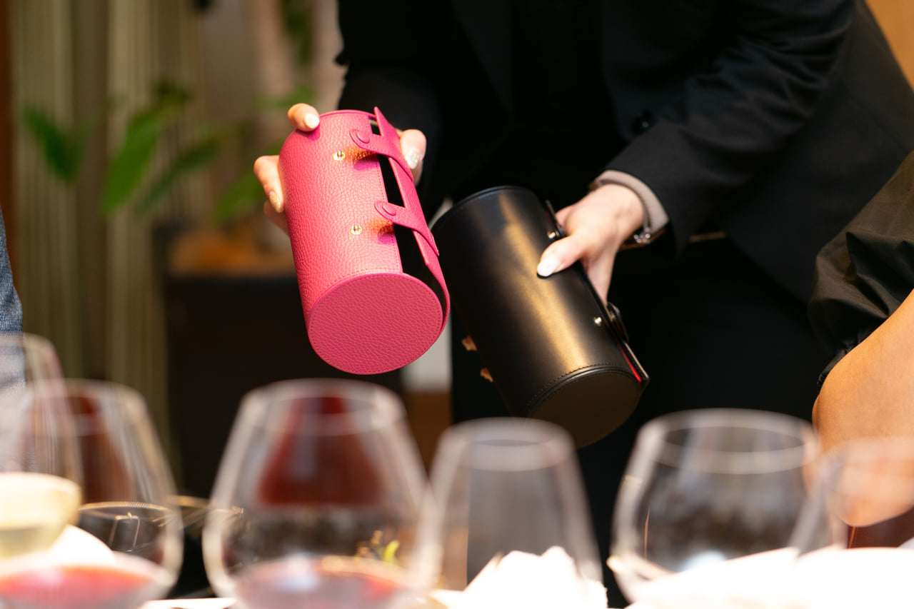 お土産は、今回の4周年イベントのテーマにもなっている「旅するグラス」に合わせての <リーデル・BYO>リーデル・ボヤージュ。 福岡限定色のマゼンタとシックなブラック、お好きな色をお選びいただきました。