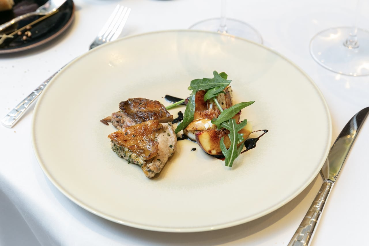熊本産ほろほろ鳥の香草炭火焼き いちじくとモッツァレラチーズのサラダ仕立て|久住EBONY 2021(久住ワイナリー)