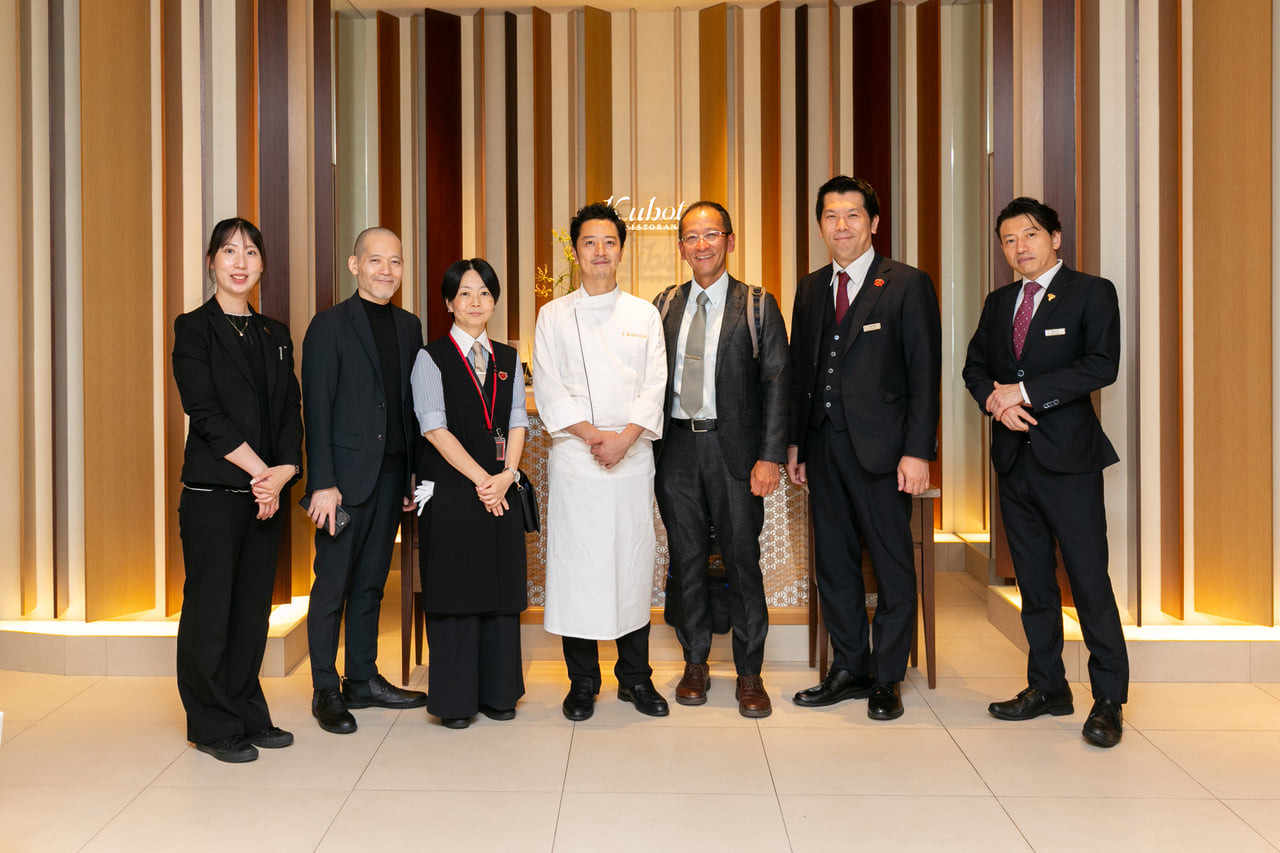 写真右から、Kubotsuソムリエ藤本さん、Kubotsu支配人千葉さん、安心院葡萄酒工房・古屋工房長、窪津シェフ、リーデル吉永、庄司、リーデル木村